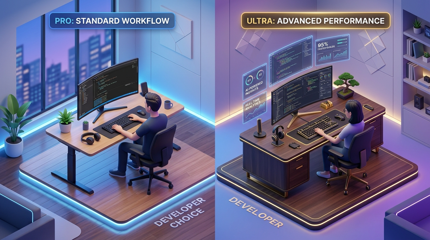 開発スタイル、プロジェクト規模、AIへの期待値で判断します。個人開発者や小規模プロジェクトならPro、大規模なコードベースを扱うチーム開発者やAIを頻繁に利用するプロフェッショナルならUltraが最適です。