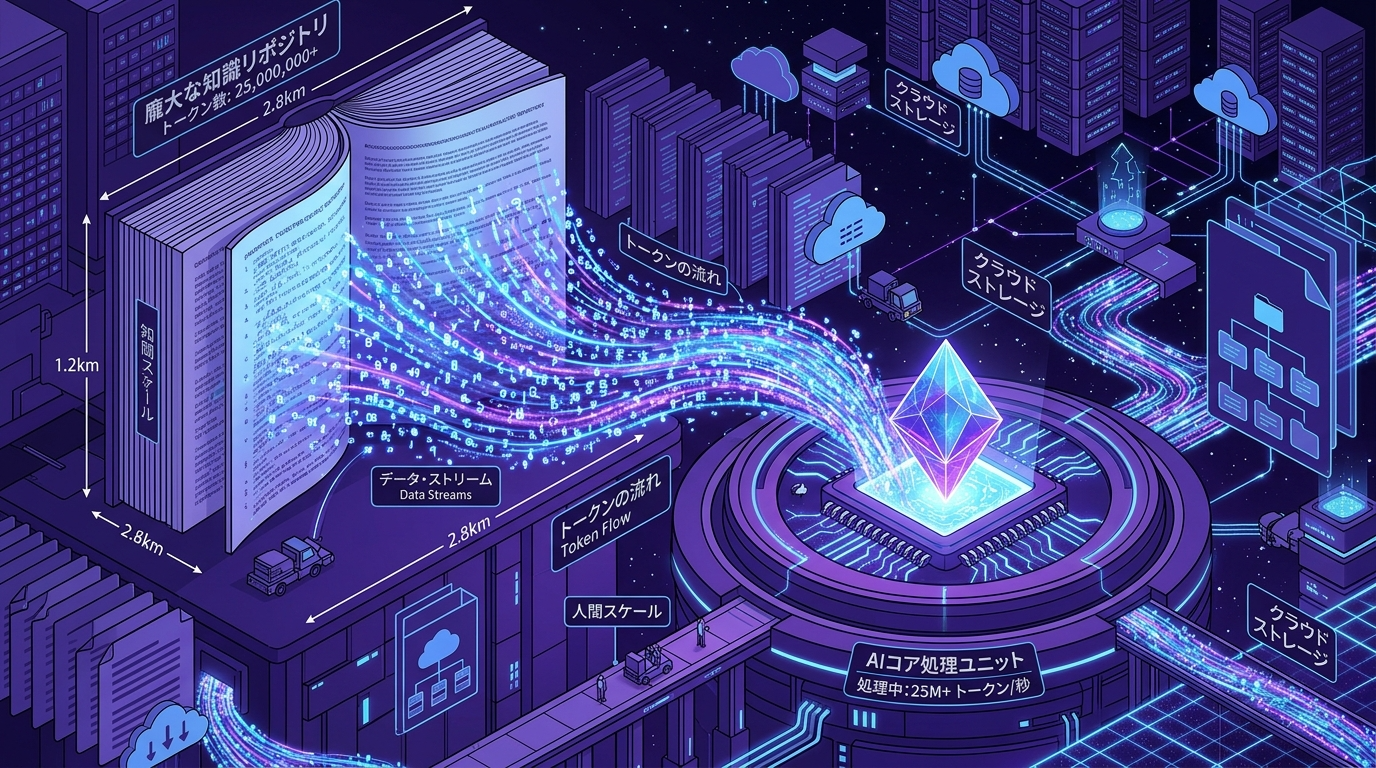AIが一度に記憶し、参照できる情報量の上限です。約3,000ページ、数万〜数十万行のコードに相当し、プロジェクト全体の設計思想や依存関係まで深く理解することを可能にします。